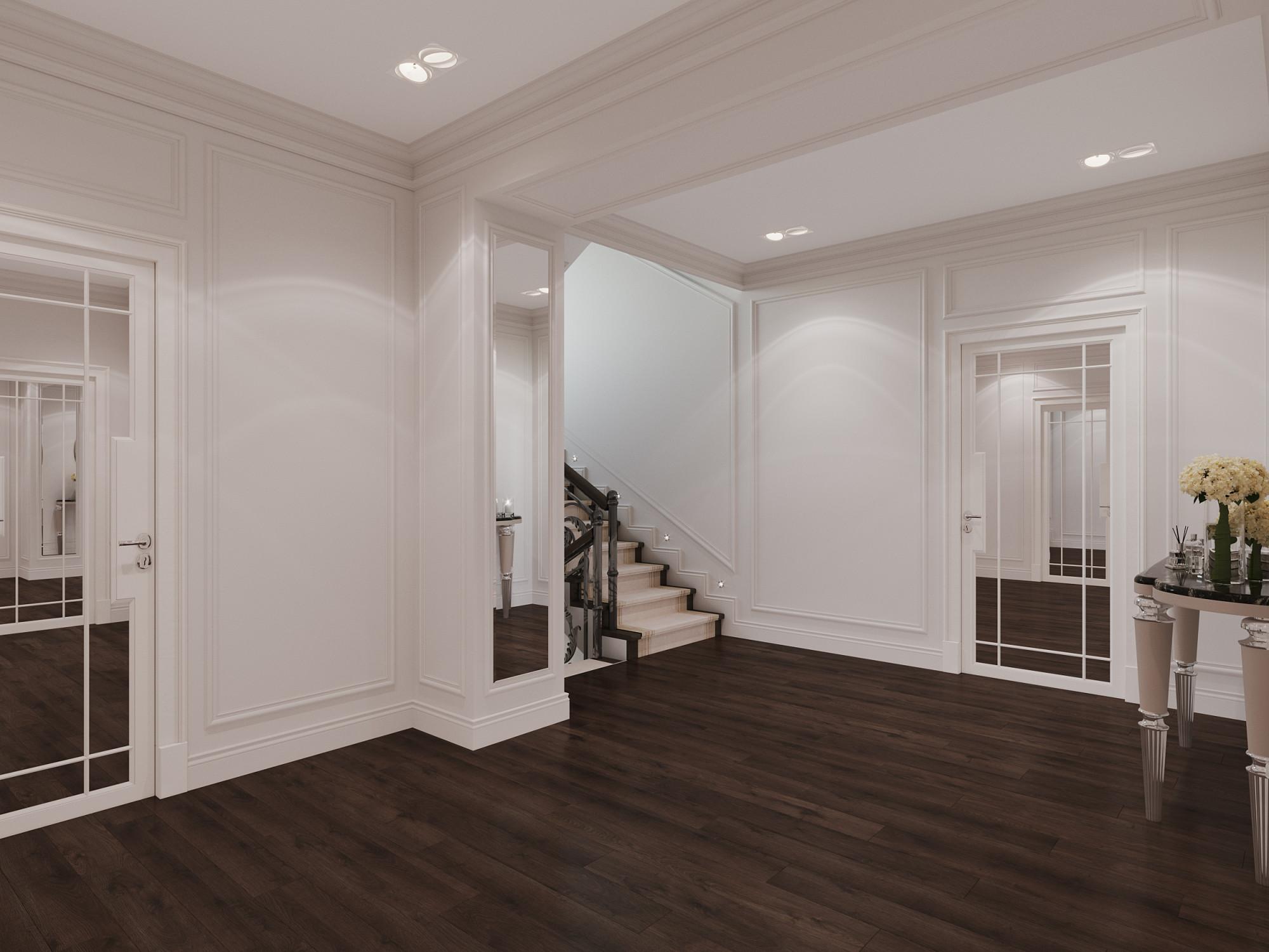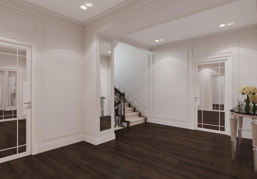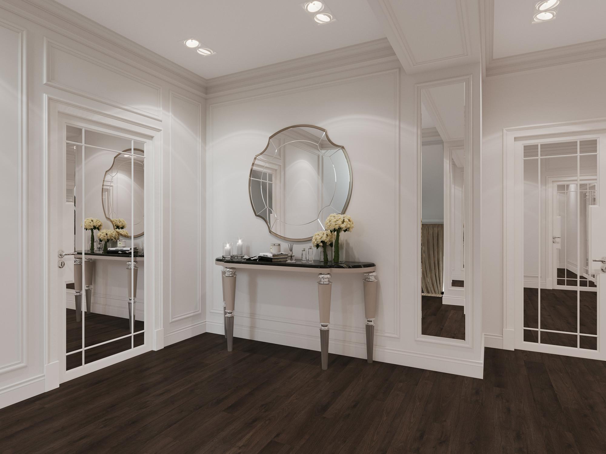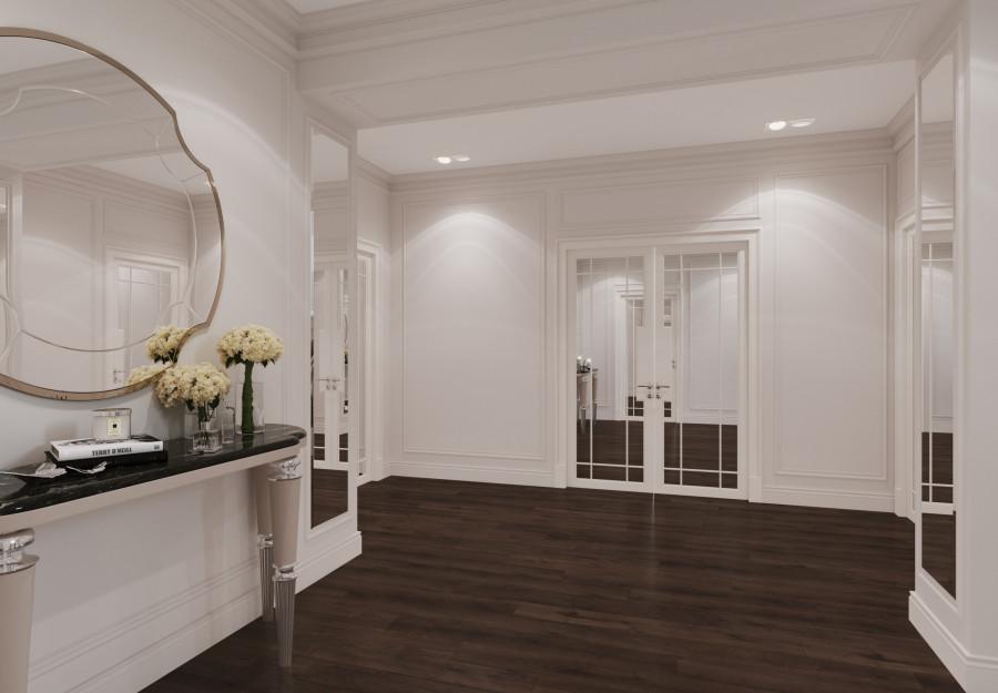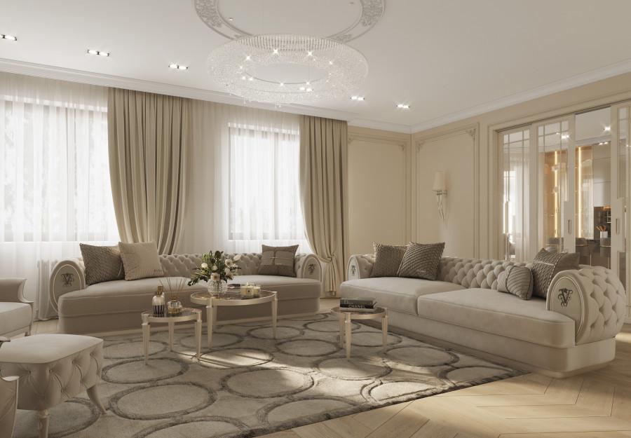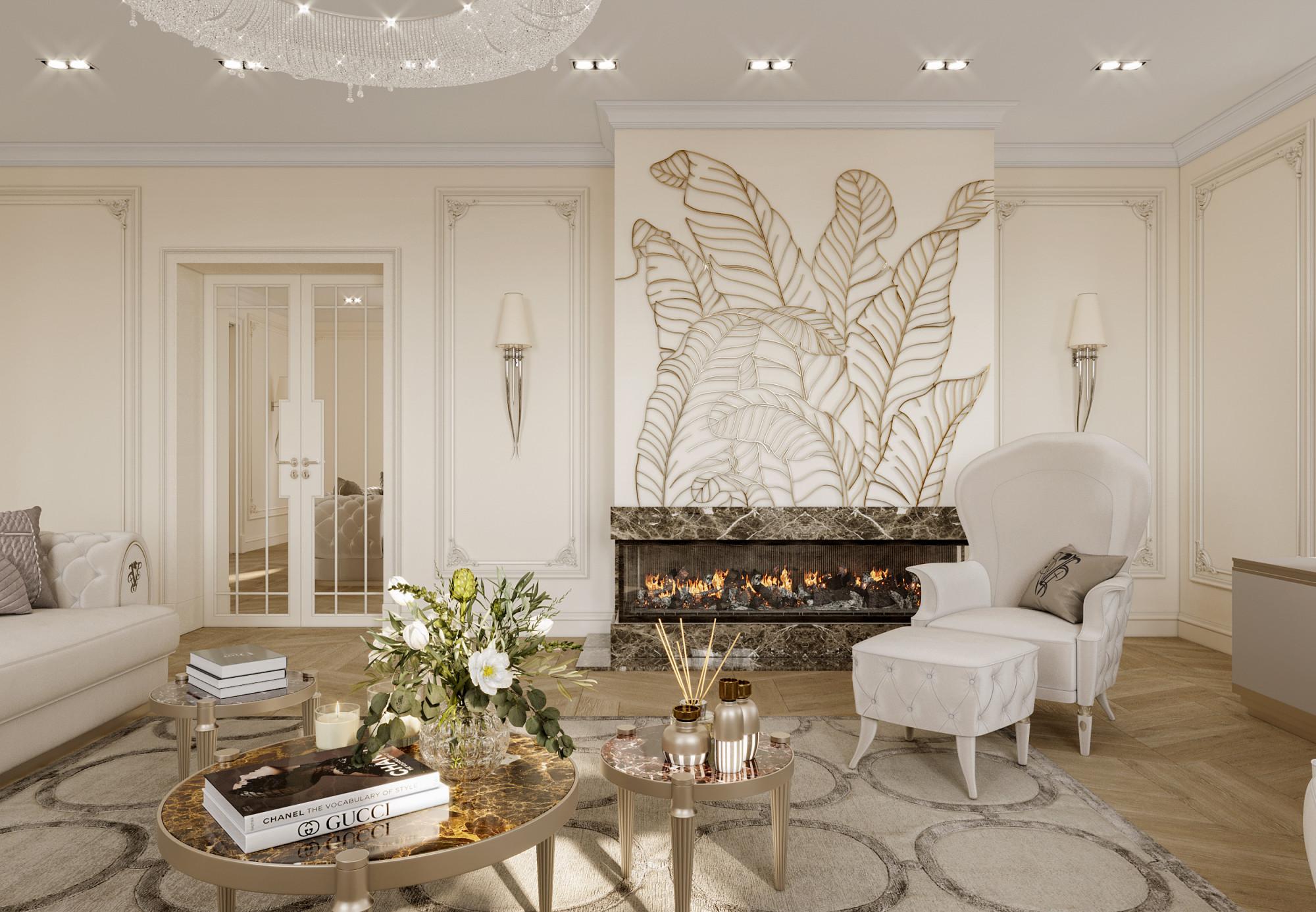 An example of impeccable modern classical interior design where elegance and comfort blend seamlessly with sophistication and light. Special attention is given to details: delicate decorative moldings on the walls and subtle stucco work emphasize the architectural expressiveness of the space while maintaining its lightness and airiness. The light-colored walls and ceiling visually expand the room, while the natural parquet flooring laid in a classic herringbone pattern adds warmth and coziness.