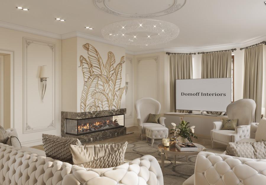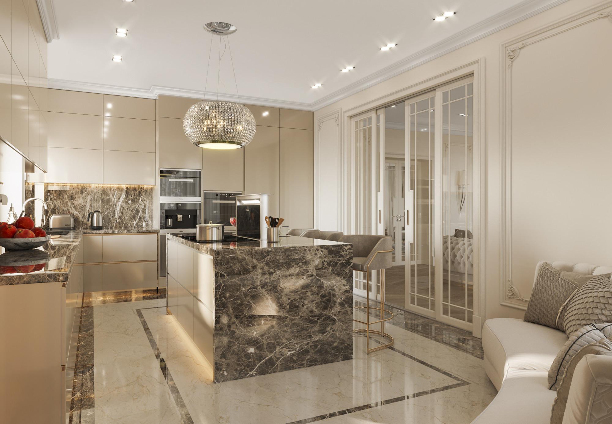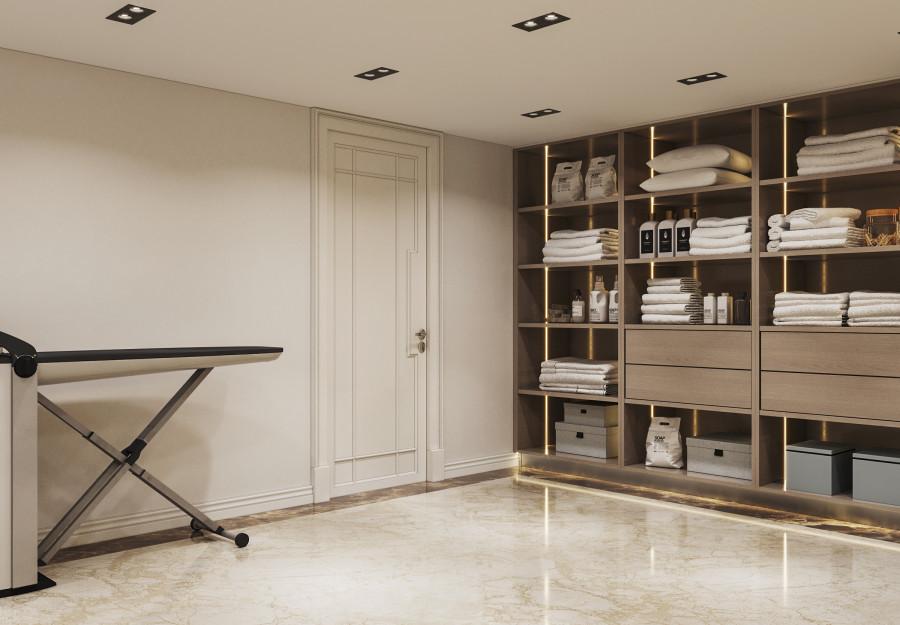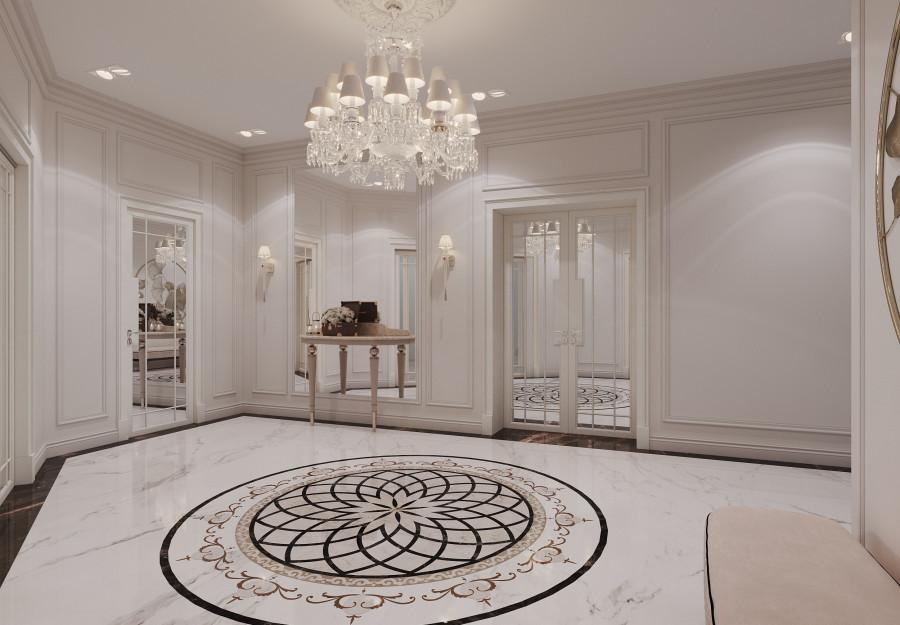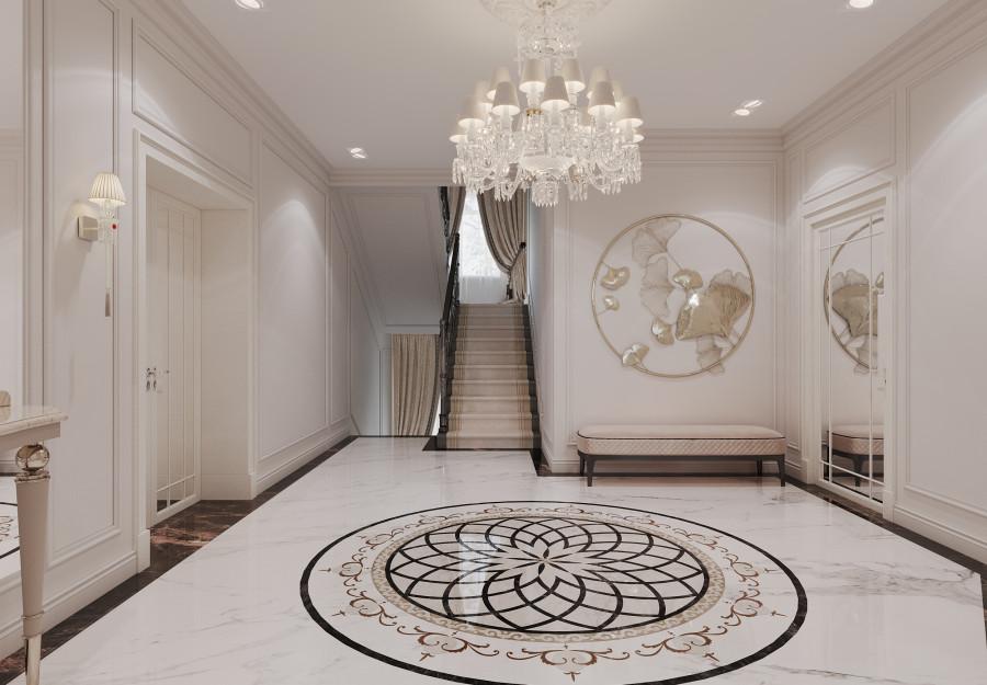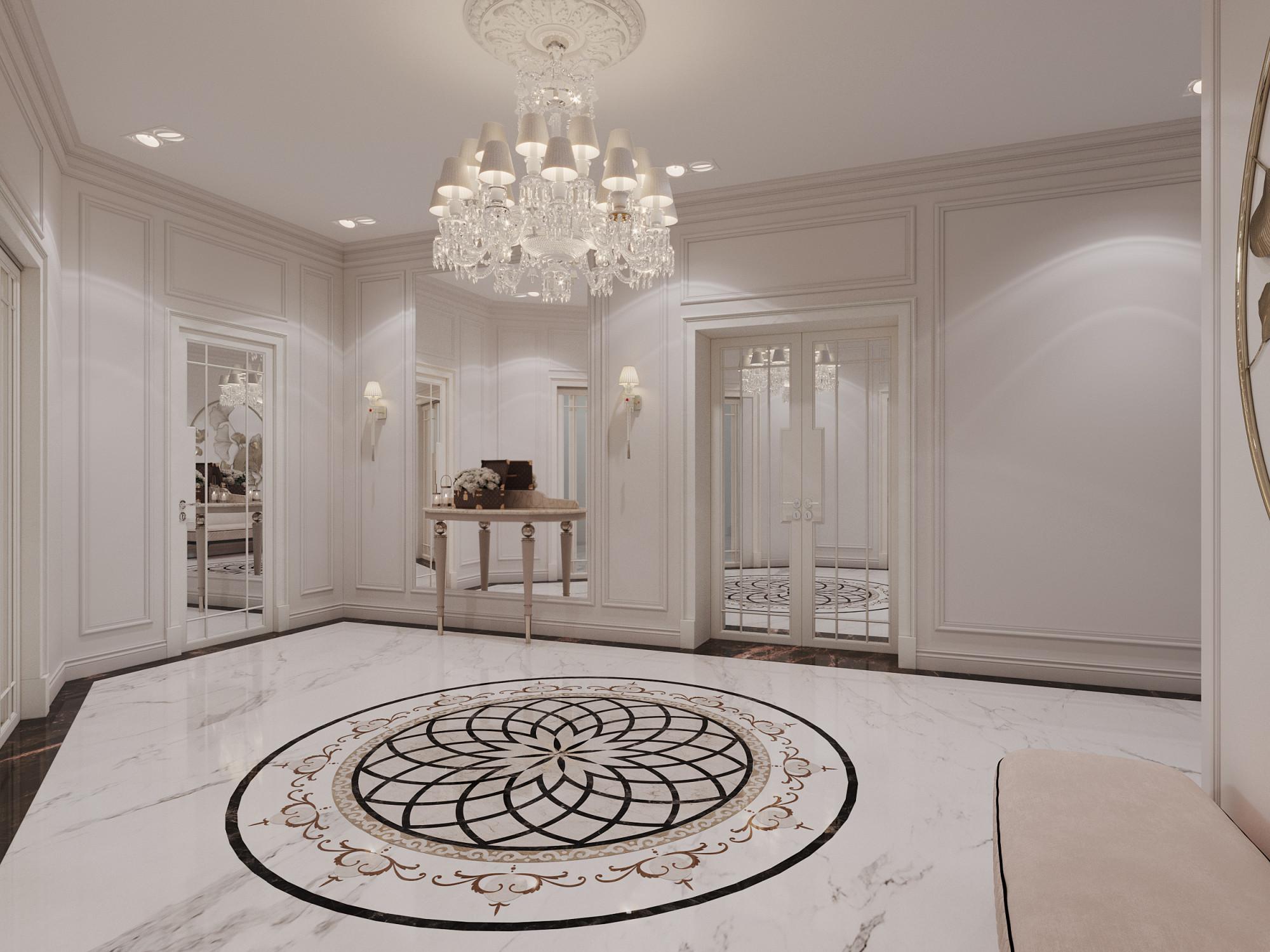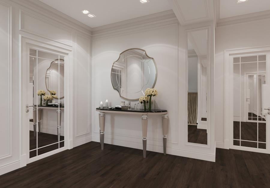 An example of impeccable modern classical interior design where elegance and comfort blend seamlessly with sophistication and light. Special attention is given to details: delicate decorative moldings on the walls and subtle stucco work emphasize the architectural expressiveness of the space while maintaining its lightness and airiness. The light-colored walls and ceiling visually expand the room, while the natural parquet flooring laid in a classic herringbone pattern adds warmth and coziness.
