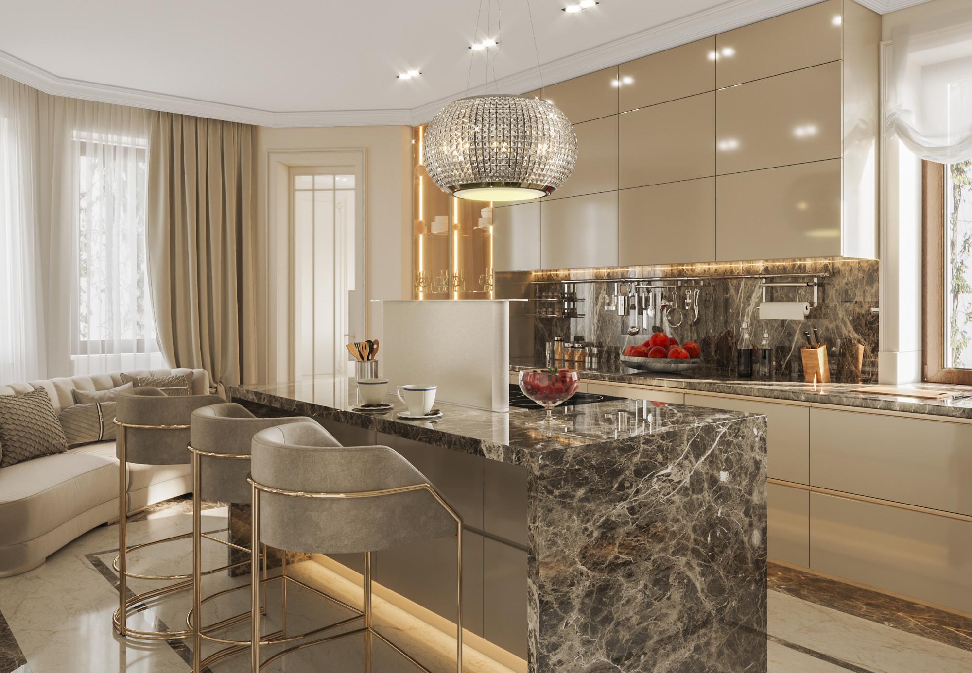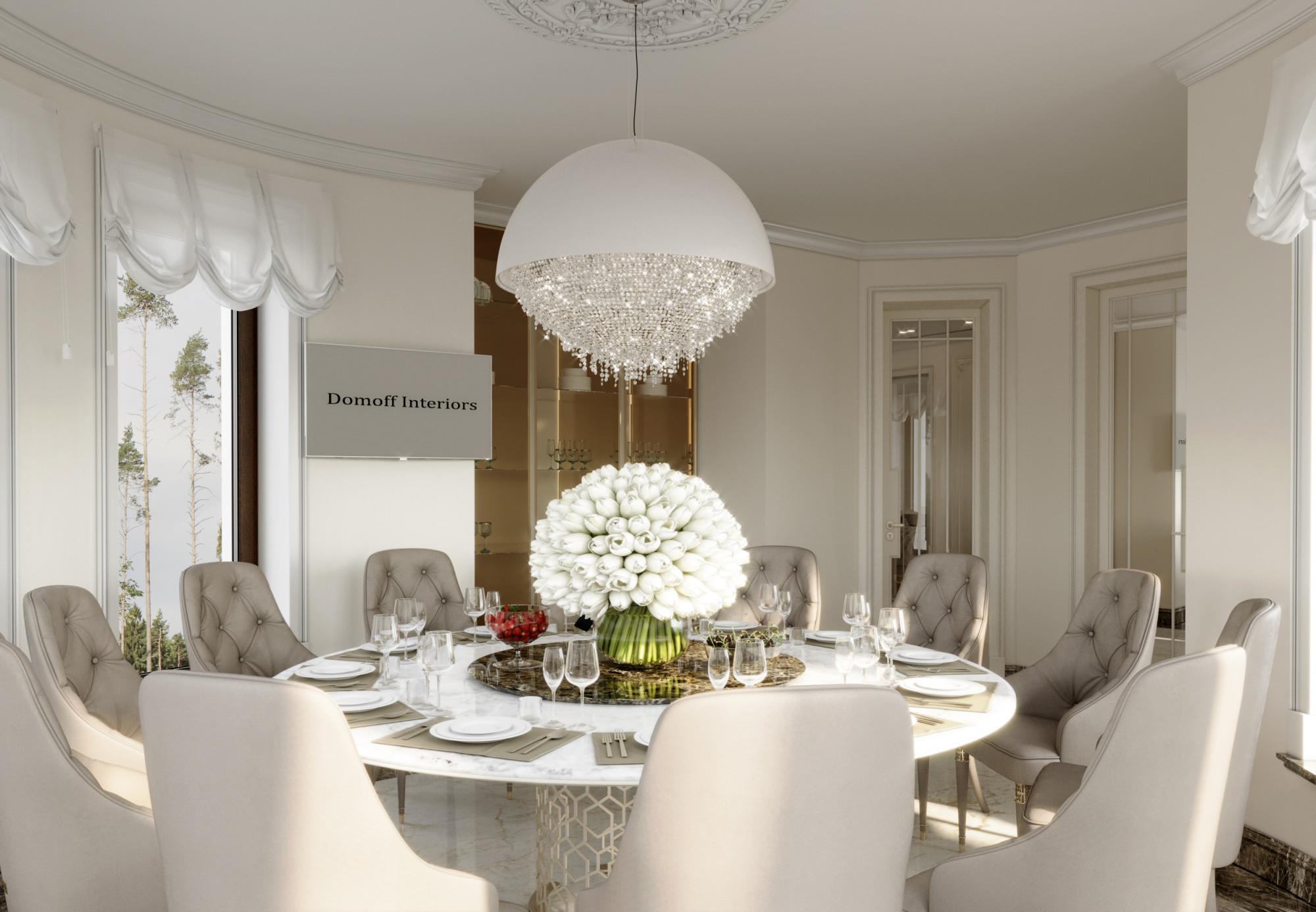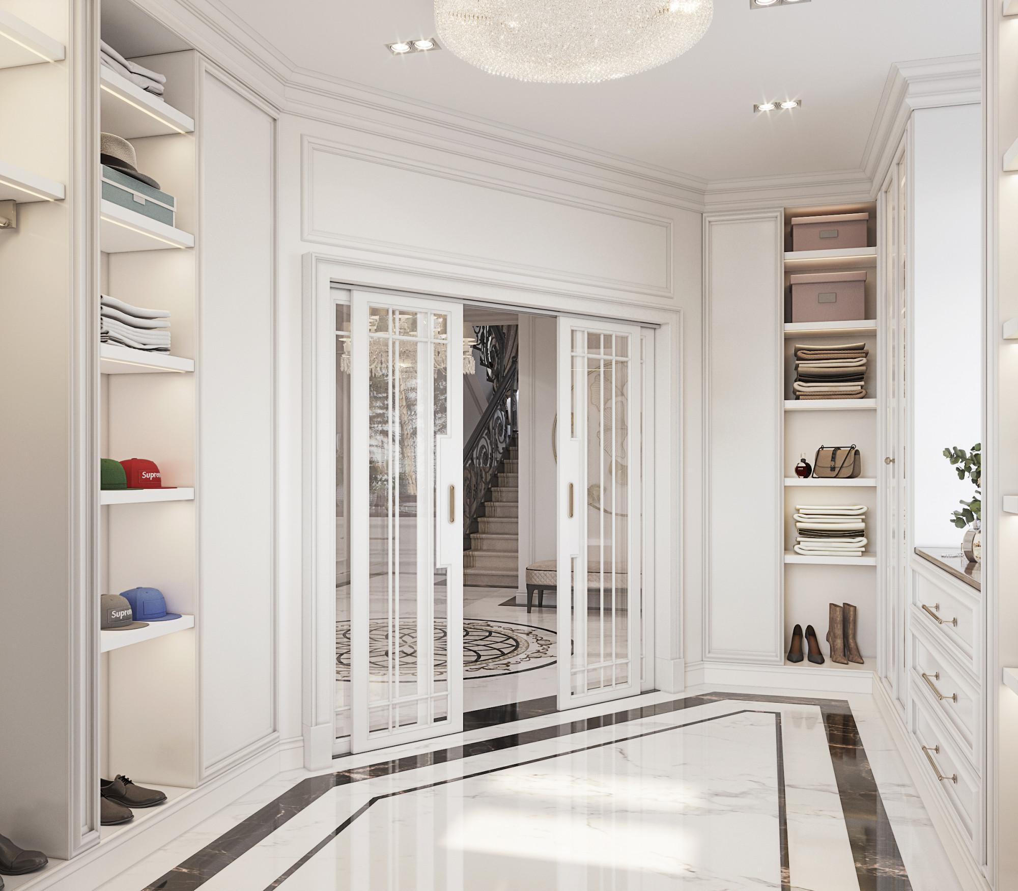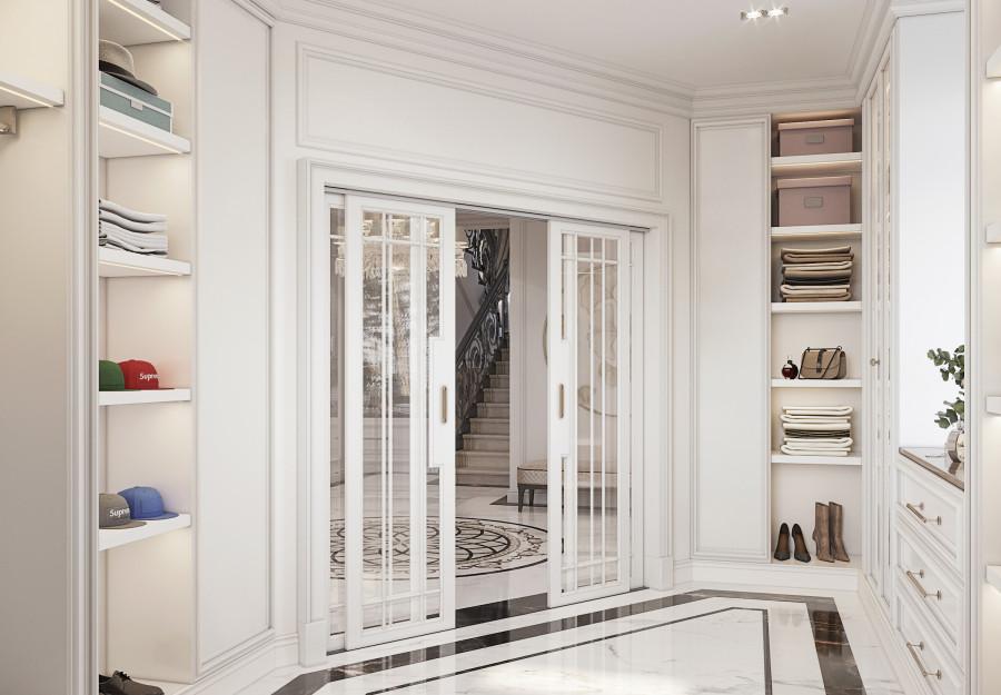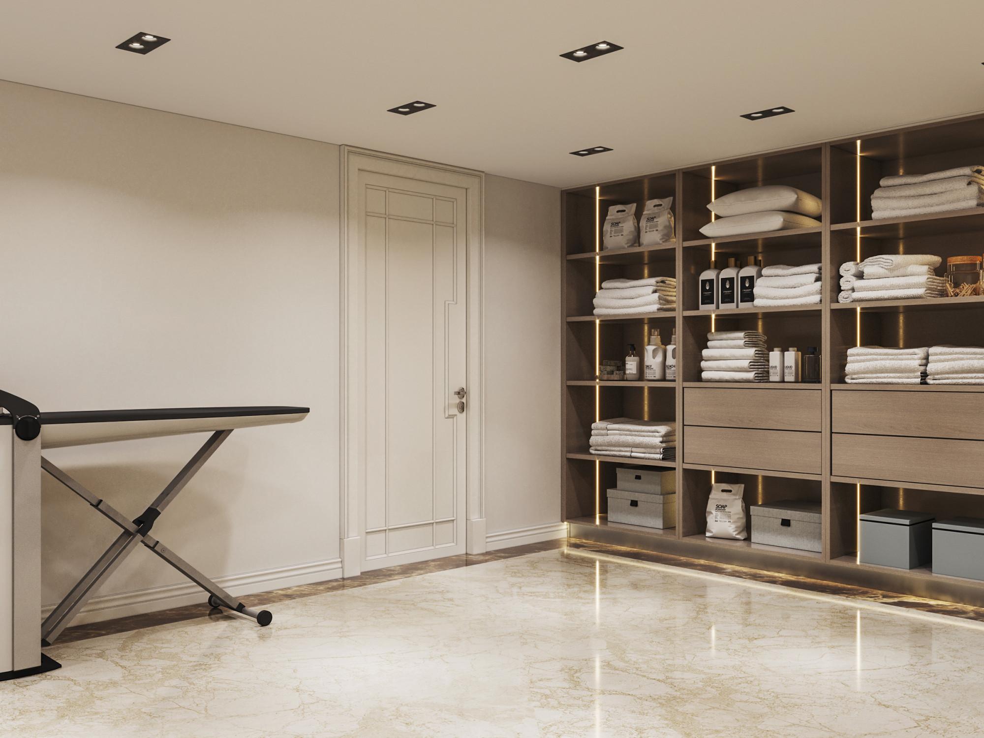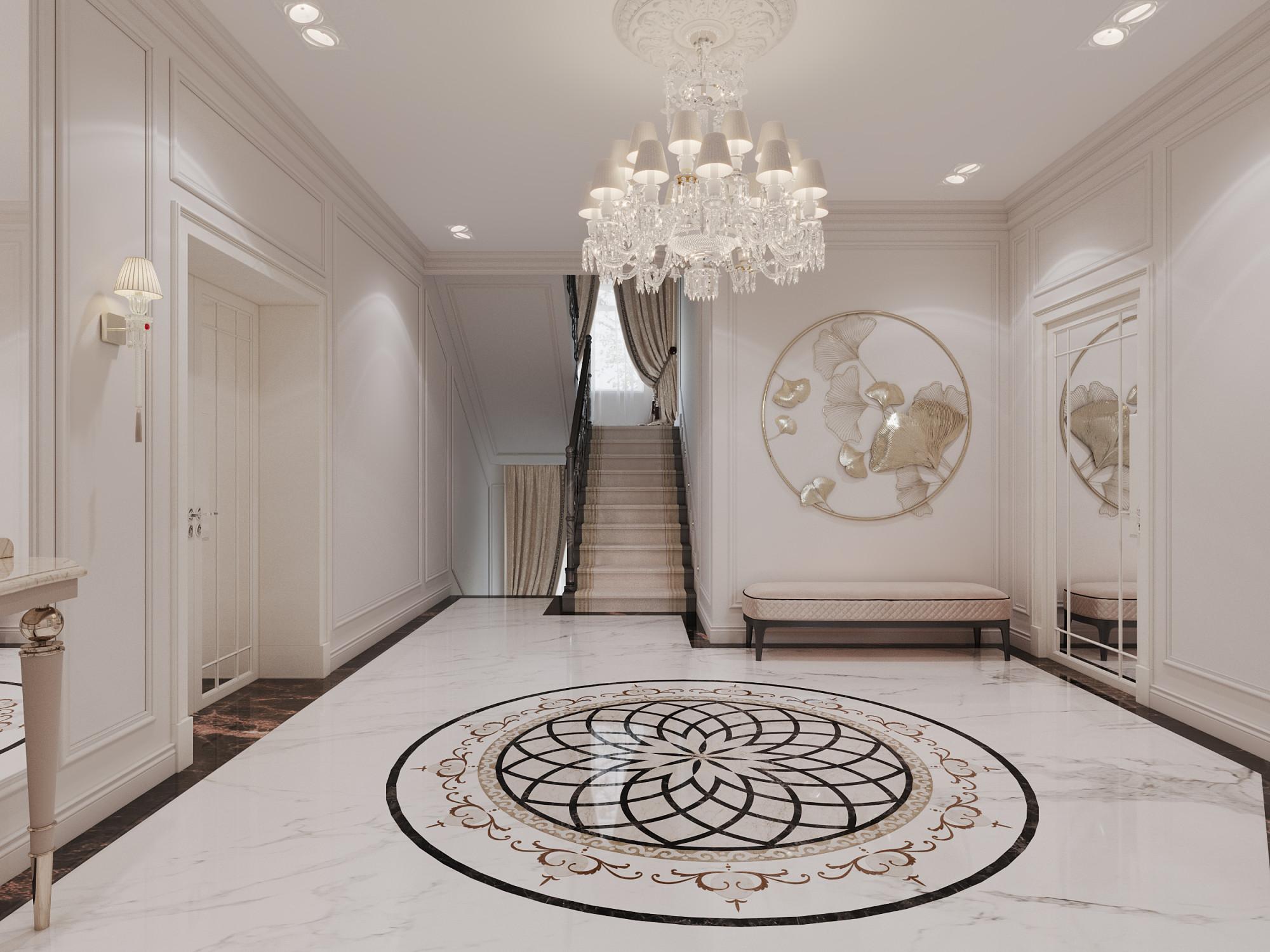 An example of impeccable modern classical interior design where elegance and comfort blend seamlessly with sophistication and light. Special attention is given to details: delicate decorative moldings on the walls and subtle stucco work emphasize the architectural expressiveness of the space while maintaining its lightness and airiness. The light-colored walls and ceiling visually expand the room, while the natural parquet flooring laid in a classic herringbone pattern adds warmth and coziness.