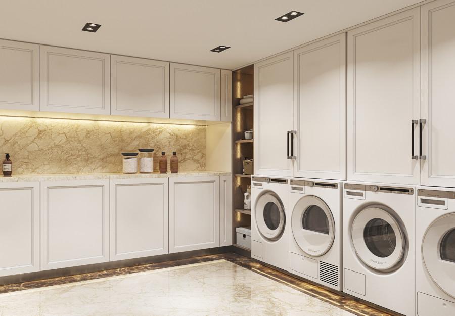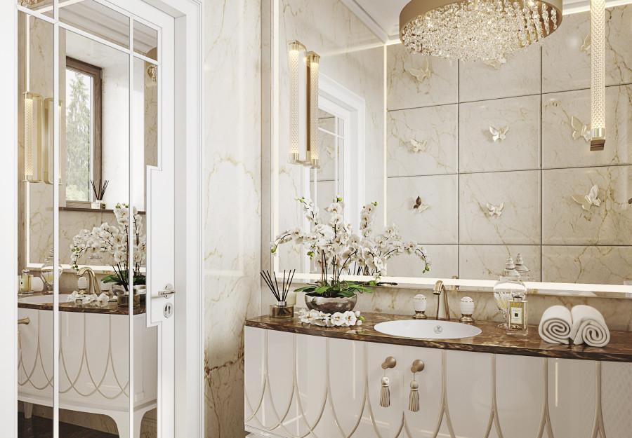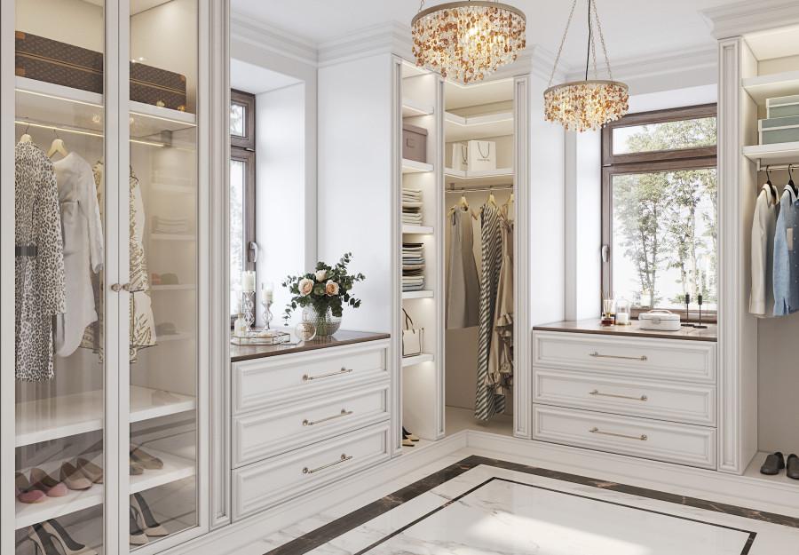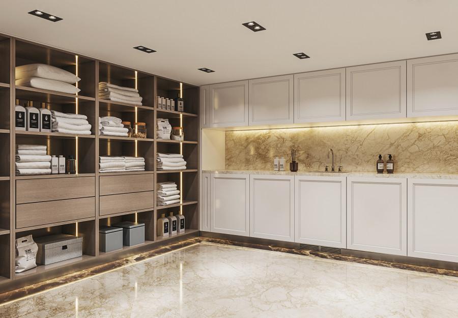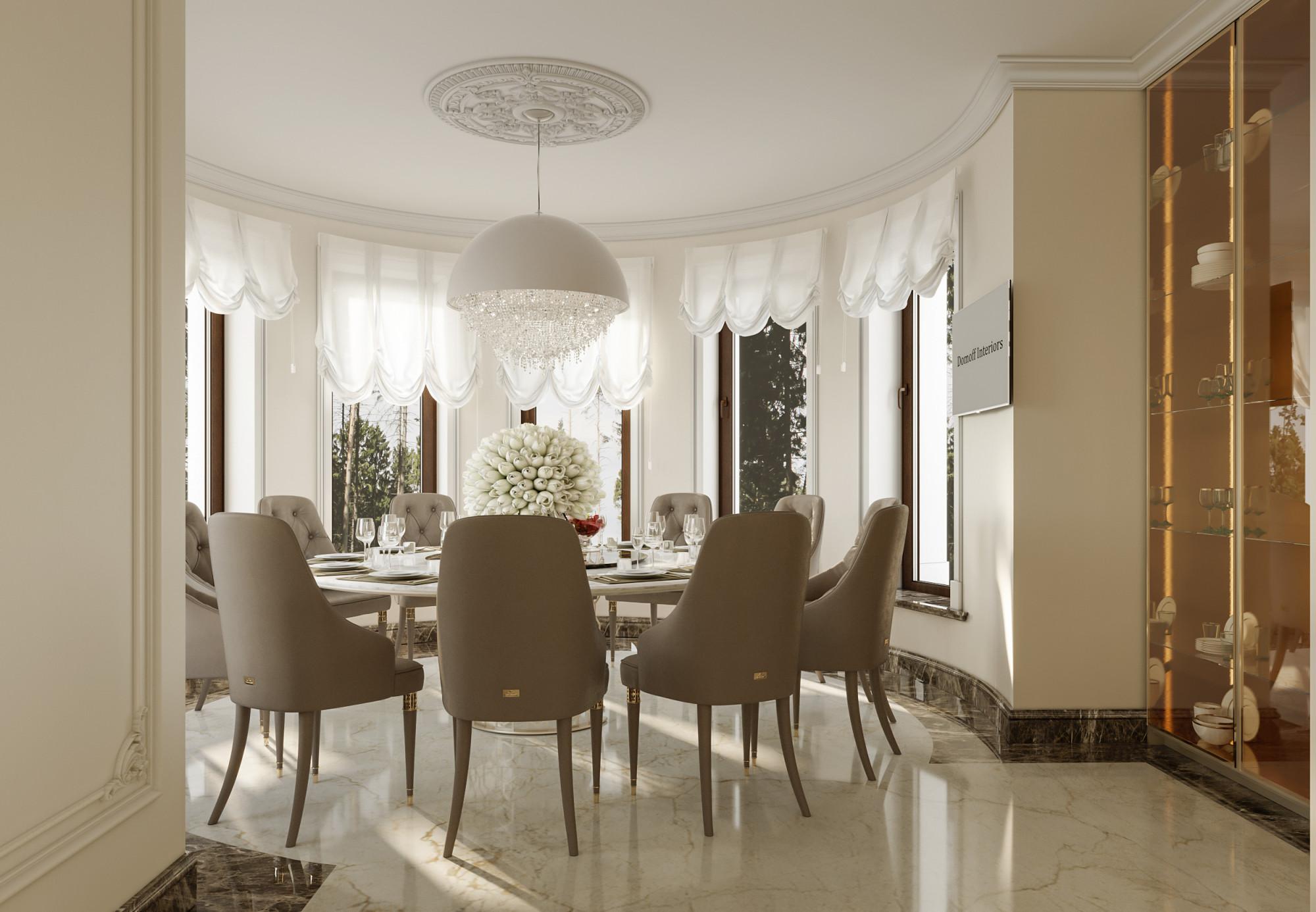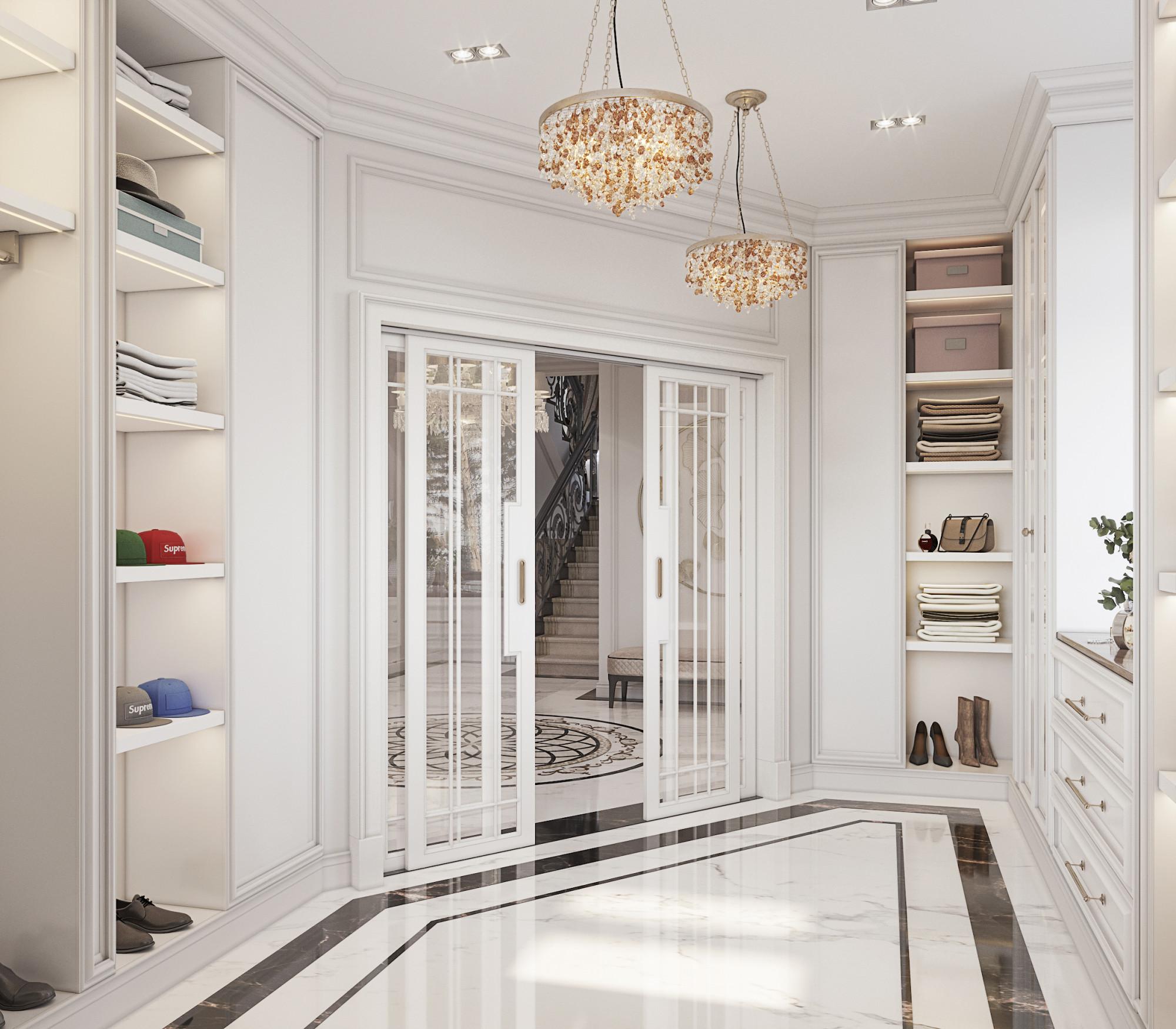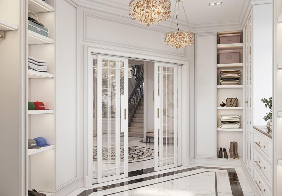 An example of impeccable modern classical interior design where elegance and comfort blend seamlessly with sophistication and light. Special attention is given to details: delicate decorative moldings on the walls and subtle stucco work emphasize the architectural expressiveness of the space while maintaining its lightness and airiness. The light-colored walls and ceiling visually expand the room, while the natural parquet flooring laid in a classic herringbone pattern adds warmth and coziness.