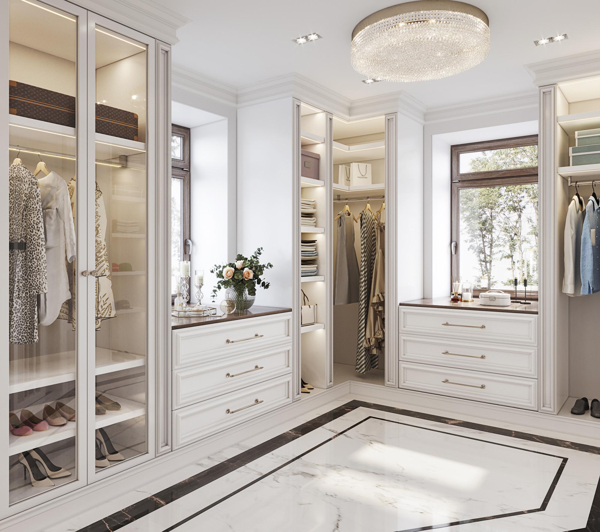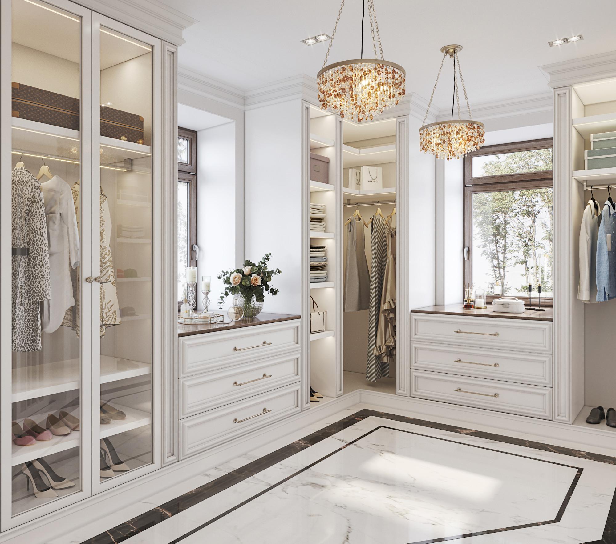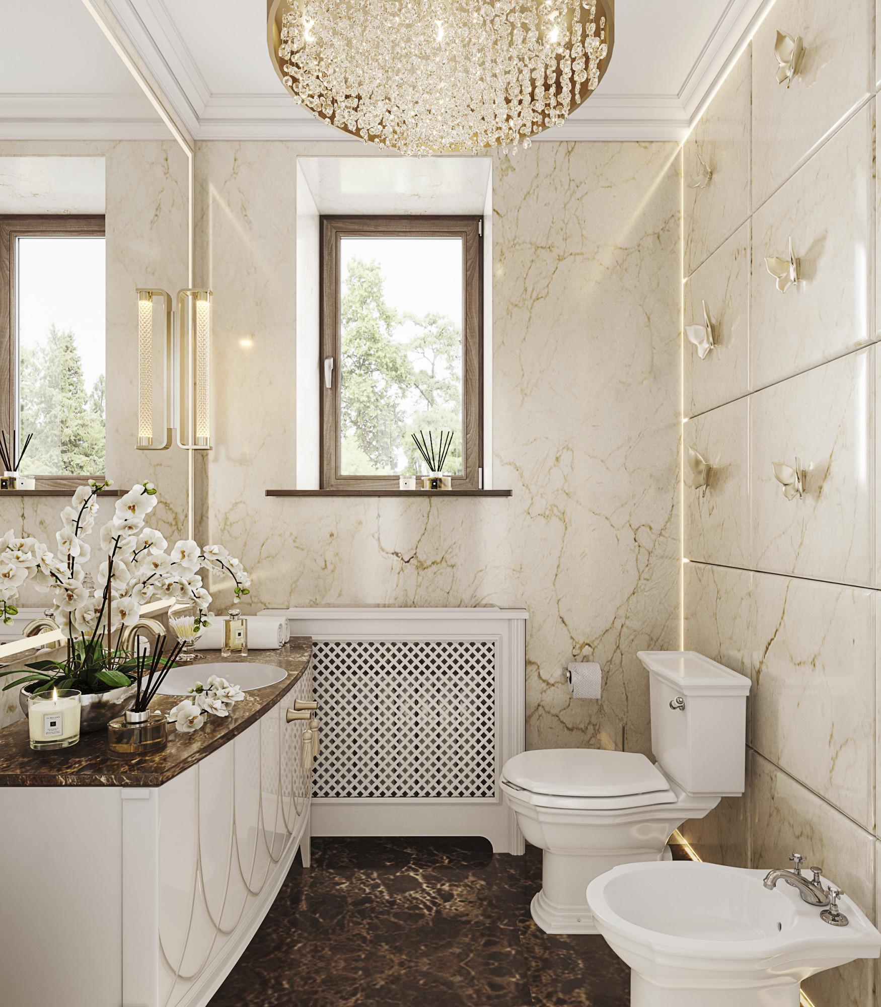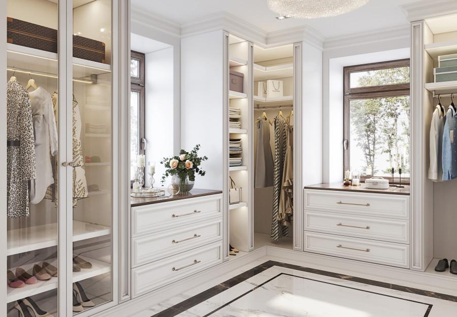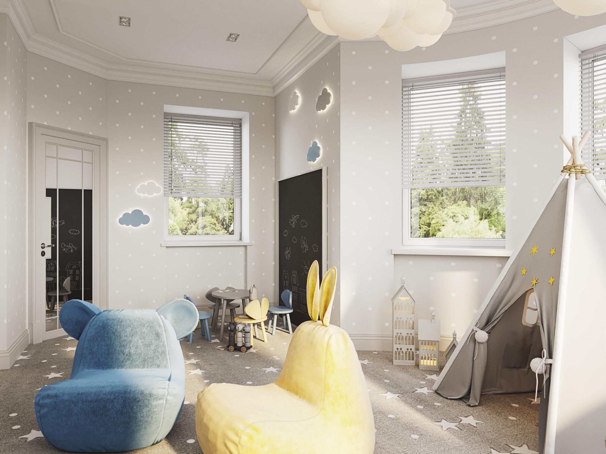 An example of impeccable modern classical interior design where elegance and comfort blend seamlessly with sophistication and light. Special attention is given to details: delicate decorative moldings on the walls and subtle stucco work emphasize the architectural expressiveness of the space while maintaining its lightness and airiness. The light-colored walls and ceiling visually expand the room, while the natural parquet flooring laid in a classic herringbone pattern adds warmth and coziness.