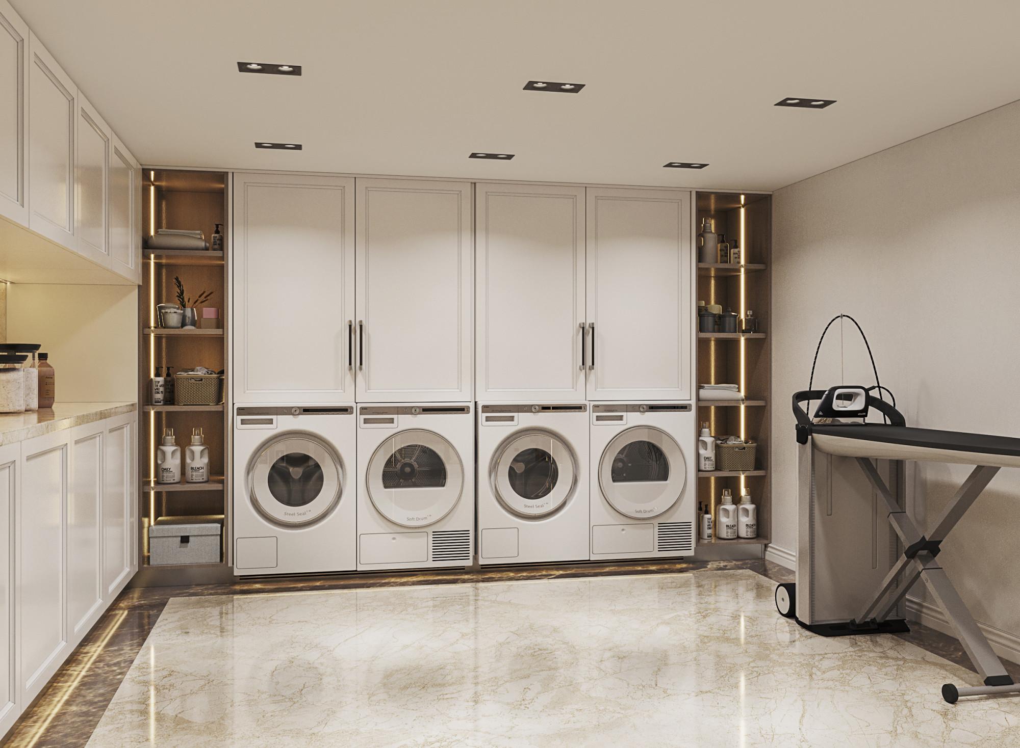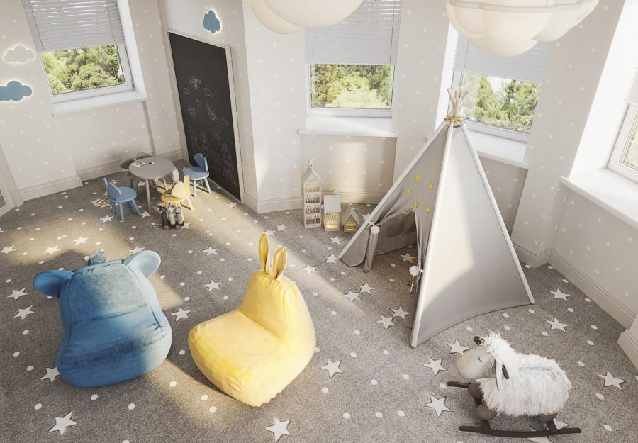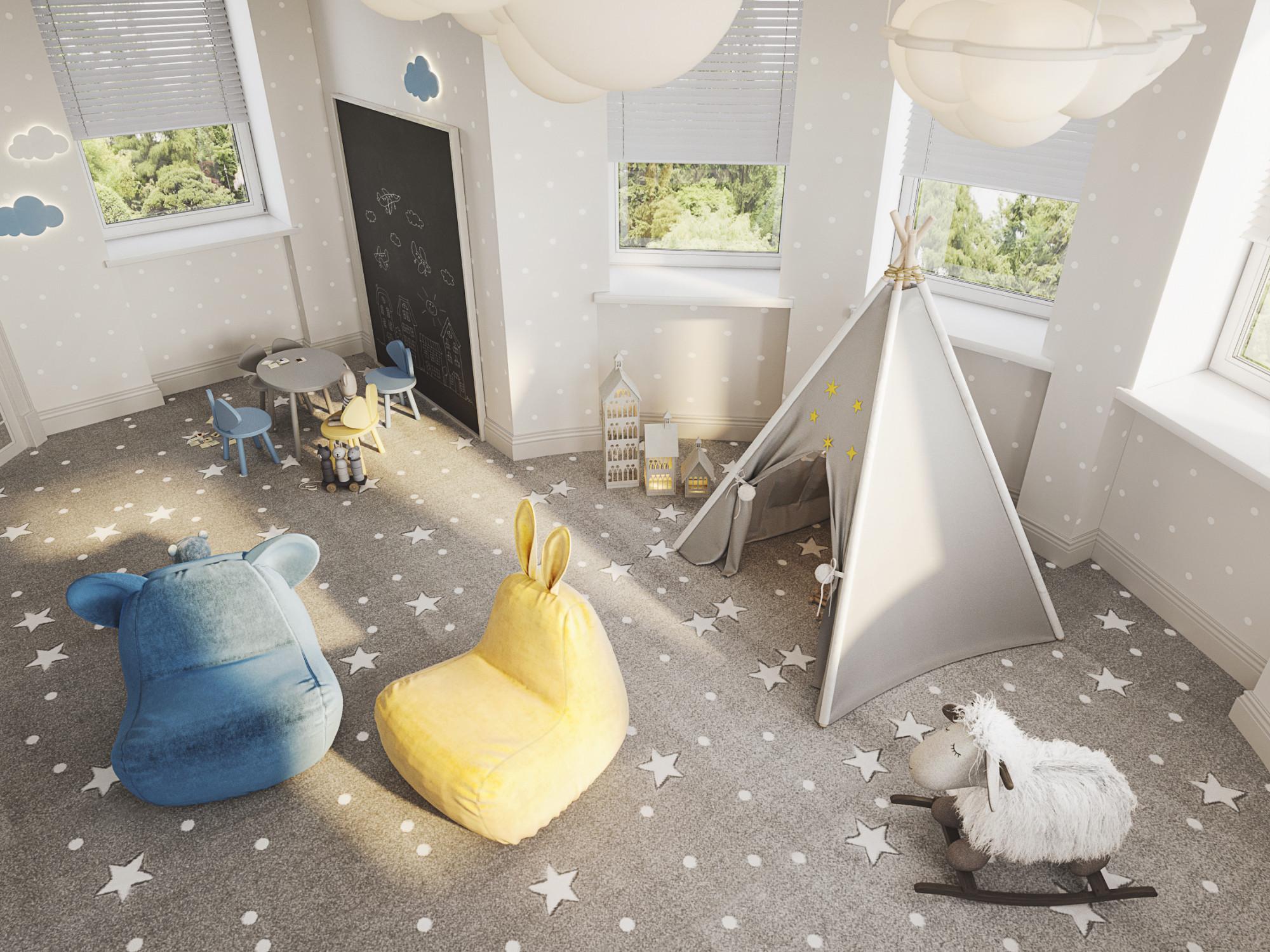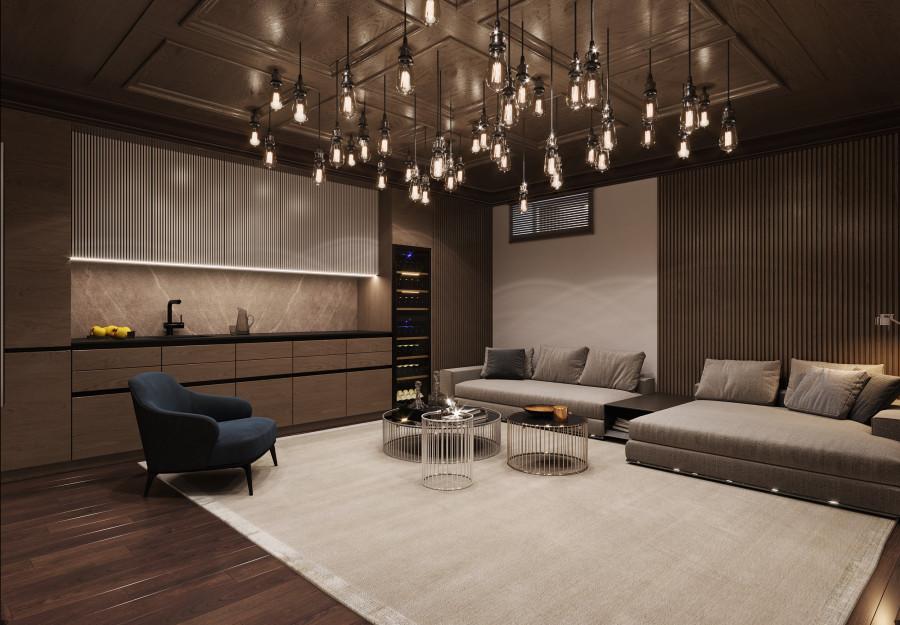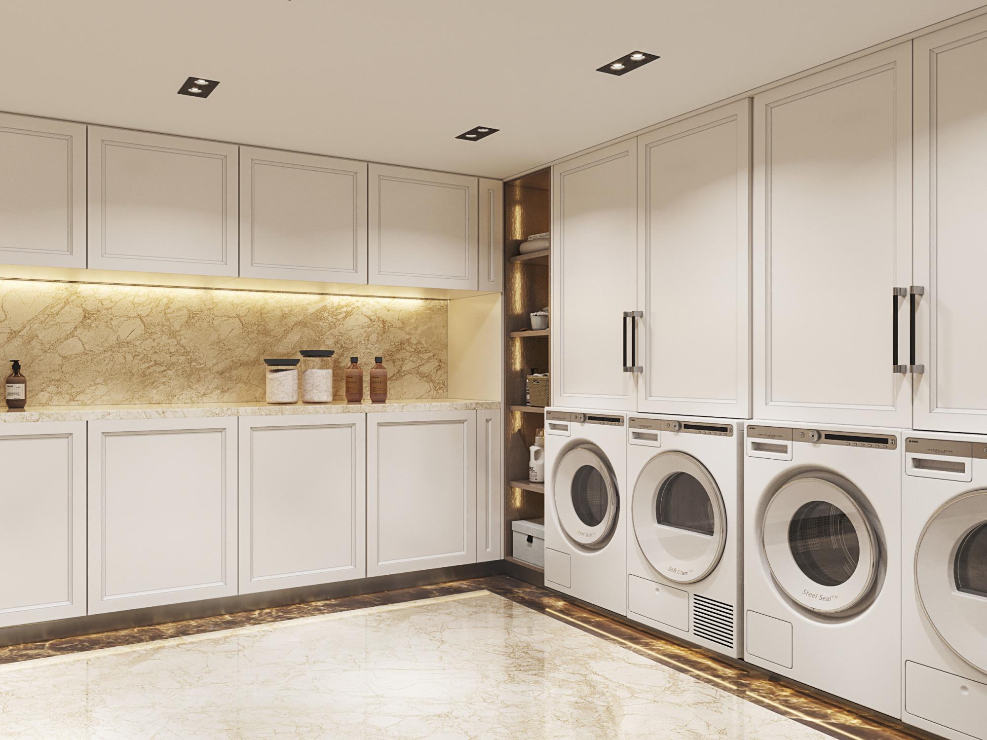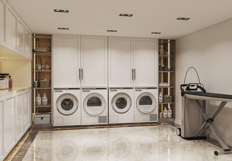 An example of impeccable modern classical interior design where elegance and comfort blend seamlessly with sophistication and light. Special attention is given to details: delicate decorative moldings on the walls and subtle stucco work emphasize the architectural expressiveness of the space while maintaining its lightness and airiness. The light-colored walls and ceiling visually expand the room, while the natural parquet flooring laid in a classic herringbone pattern adds warmth and coziness.